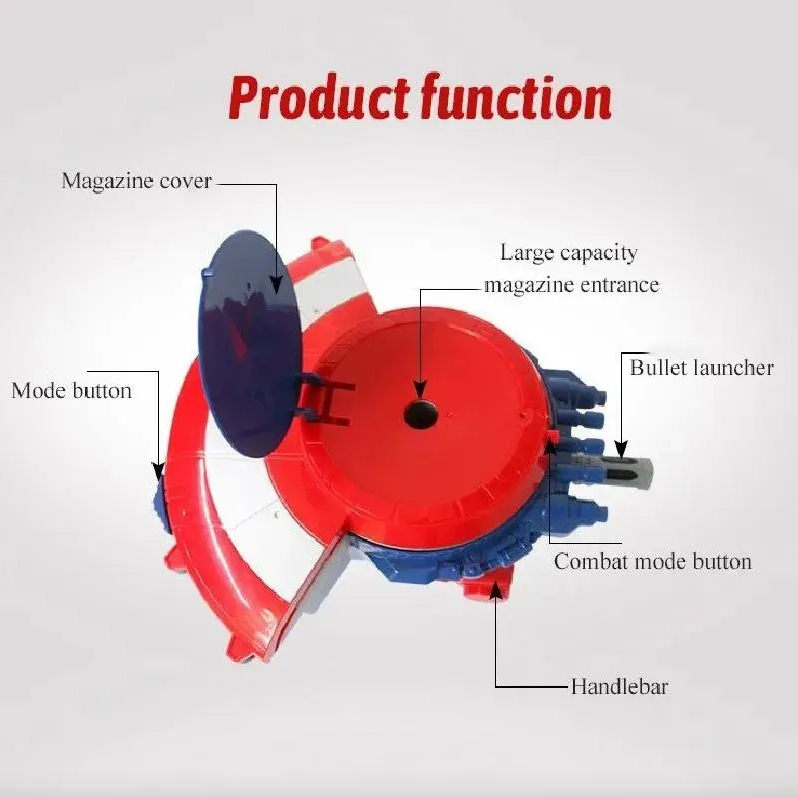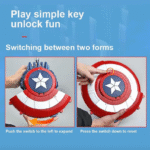 - تبدیلپذیری ۲ در ۱: محصول در حالت اصلی یک سپر با طرح ستاره نمادین است و در حالت عملیاتی، به یک تفنگ بلستر قدرتمند با قابلیت تیراندازی رگباری تبدیل میشود.