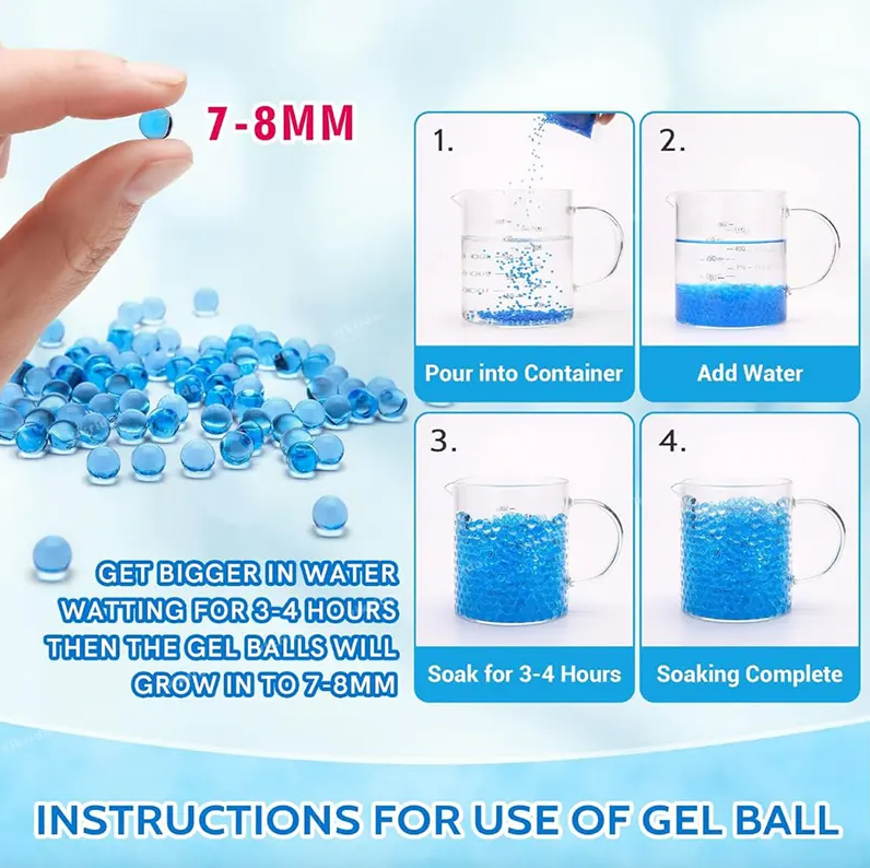 - تیراندازی ژلهای ایمن: سیستم تیراندازی از گلولههای توپ ژلهای استفاده میکند که با آب آماده میشوند و پس از برخورد به طور ایمن متلاشی میشوند (پودر ساخت توپ ژلهای در تصویر دیده میشود).