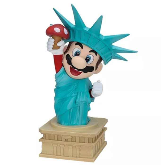 یک فیگور فانتزی و نوآورانه از سوپر ماریو، قهرمان بازیهای ویدئویی نینتندو، که لباس و تاج مجسمه آزادی را بر تن دارد. ماریو به جای مشعل، یک قارچ قرمز رنگ (Super Mushroom) را در دست خود بالا گرفته است.